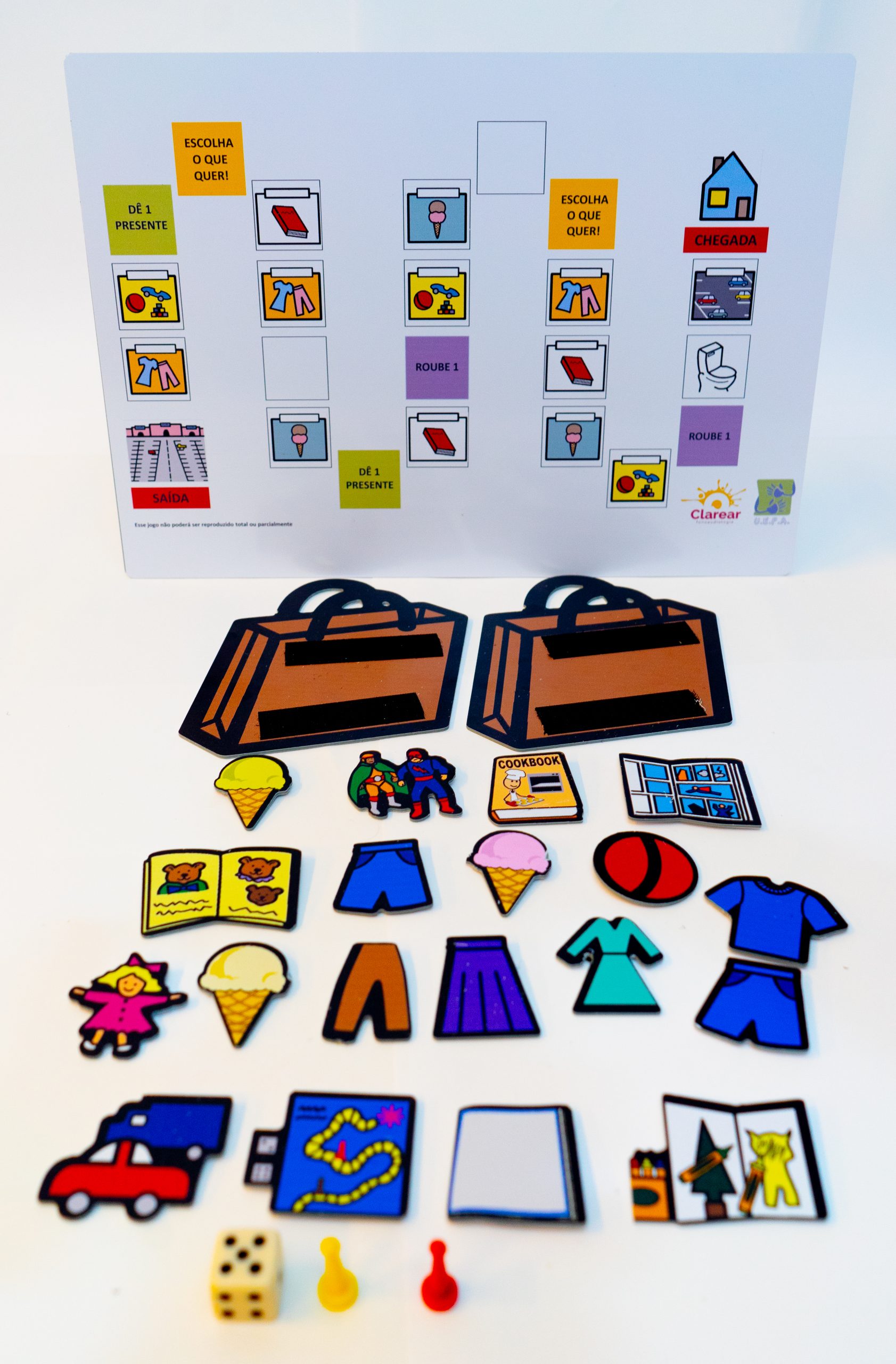 Este jogo visa estimular o uso da função de pedido de ação, enfatizando os padrões “vamos para” e ações “comprar”, explorando as categorias relacionadas a lugares, objetos, brinquedos, roupas, livros e alimentos.